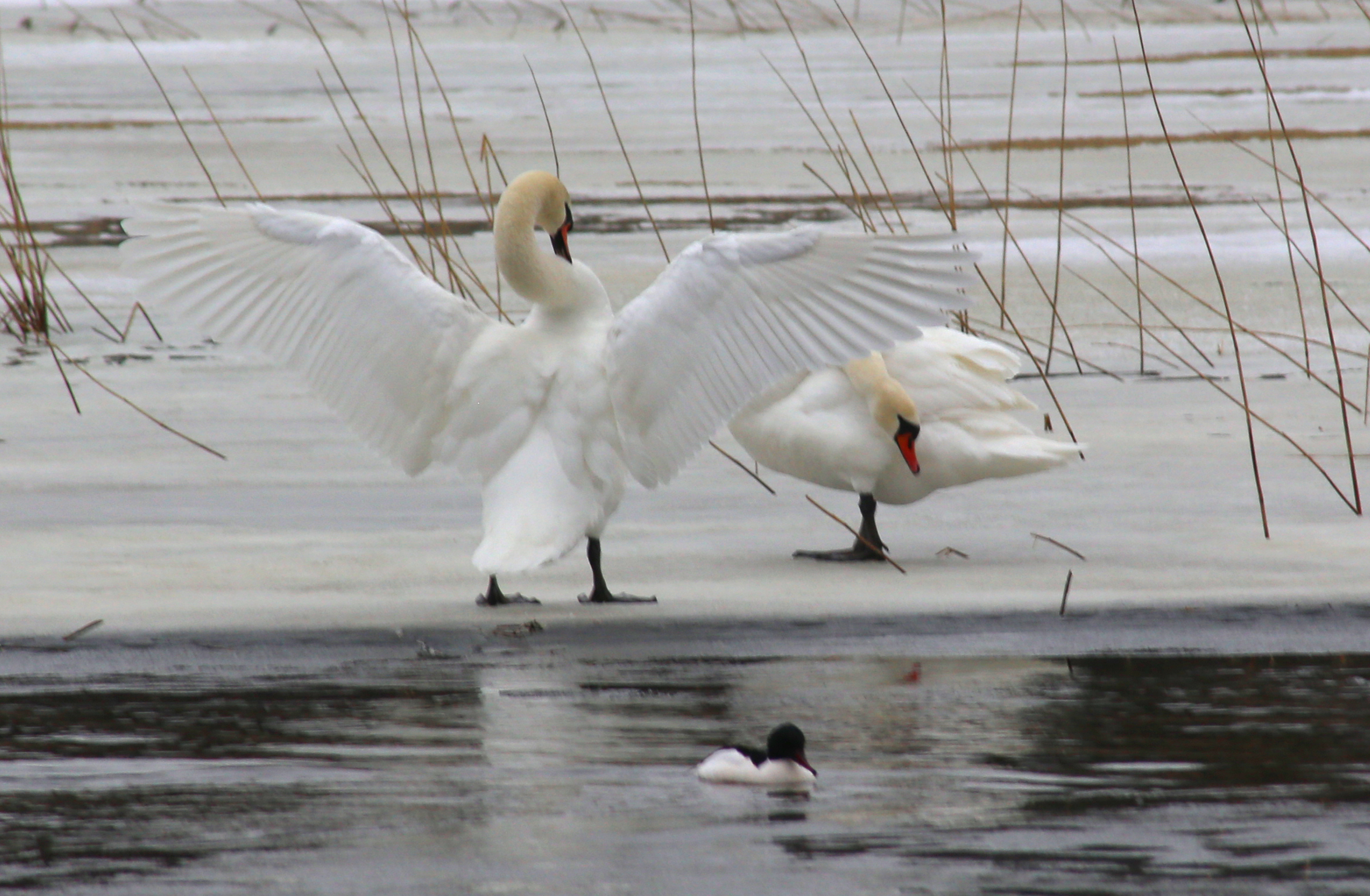 1. Heh, ehkä tuo etualalla uiskenteleva isokoskelo on sitten enemmän “makuusi”. Ei pidä suurta ääntä itsestään mutta sen saapuminen keväällä ensimmäisiin sulapaikkoihin on aina sykähdyttävä luontoelämys!!! Lauhoina talvina niitä jää myös usein talvehtimaan Ahvenanmaalle ja lähialueille. Mitä noihin “kyhmäreihin” (=Kyhmyjoutsen, toim. huom.) tulee, niin kuvan perusteella on vaikea sanoa onko kyseessä jonkinnäköinen uhittelu vaiko vain vedestä jäälle nousseen yksilön “kuivatusoperaatio”. Ornitologian maailma kaipaa nyt lisätietoa, mitä tapahtui ennen ja jälkeen kuvan oton:):):)